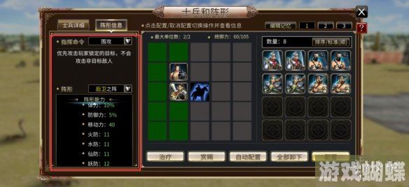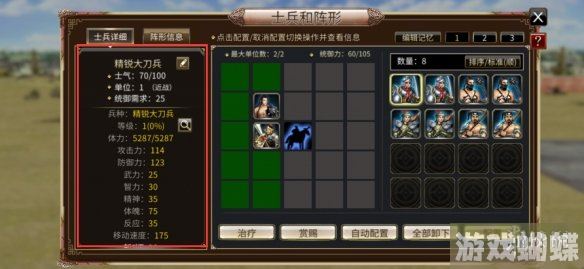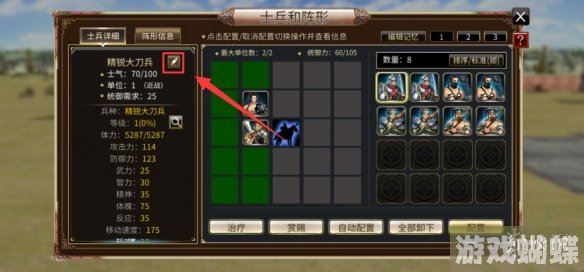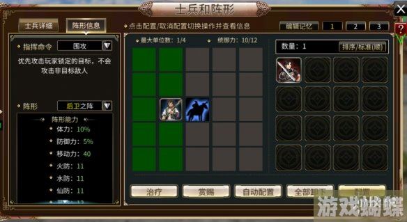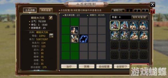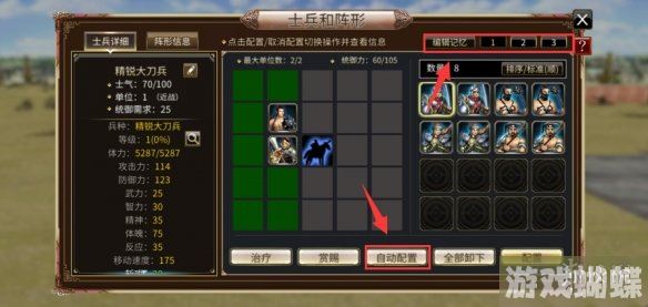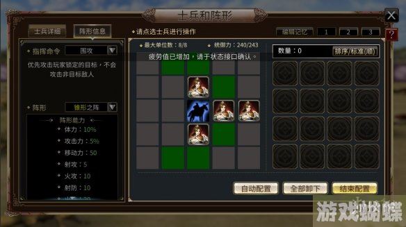 士兵具有自动配置和记忆配置功能,点击“自动配置”按钮,会从最上方的士兵开始依序配置到统御力或出战单位满为止,统御力为玩家的统御值+5。
