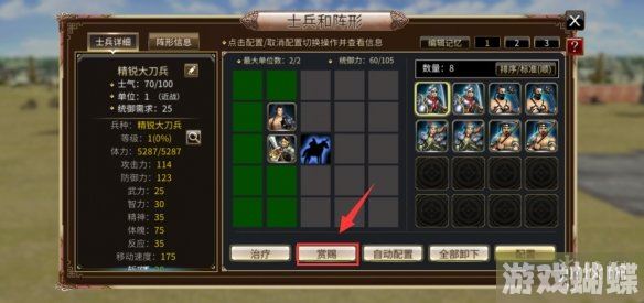 点击“士兵”按钮可以打开士兵界面,玩家可以在此界面中排兵布阵,选择随玩家出战的士兵,在此界面中可以对士兵进行“治疗”、“赏赐”、“配置和卸下士兵”等操作。还可以针对不同的情况,为士兵们配置不同的阵形。