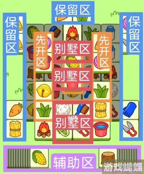 1.两个长形别墅,一个方形大别墅,开局先消除橙色区。这里压牌比较多,然后按照一层层均匀消除表面牌。