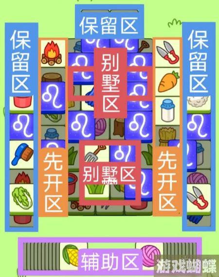 1.一个十字型大别墅,一个方形大别墅,开局先消除星座牌,再从橙色区开始消除。