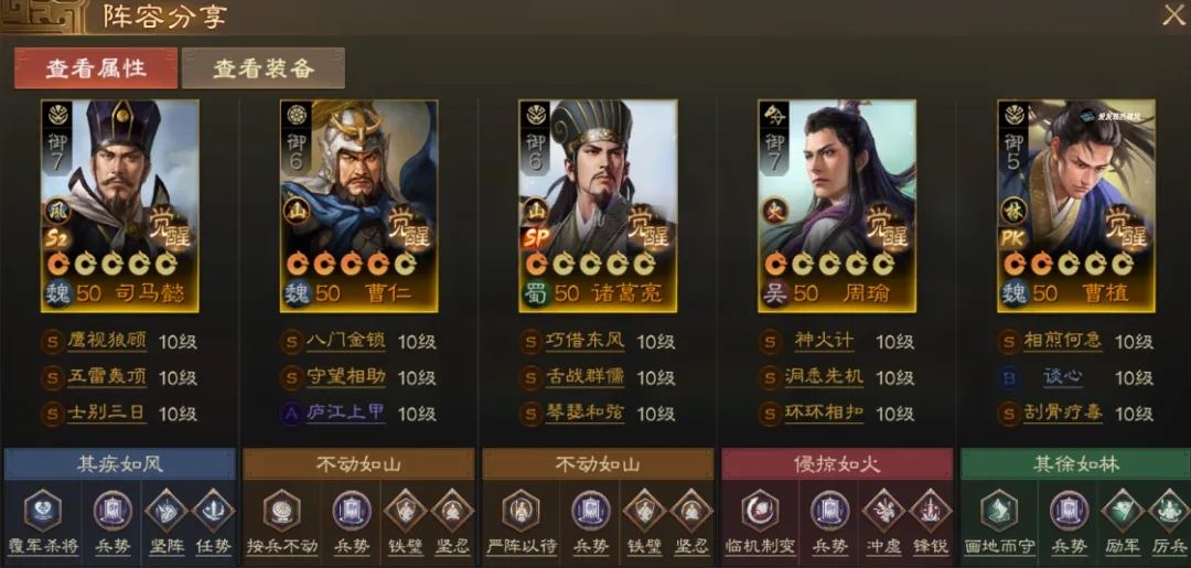 这里让袁术带了两个召唤战法,自动基本就不会放错,而且因为可以经常放自带,会更肉。如果想打多点输出,也可以带腹有鳞甲+浸微浸灭和临机制变兵书走平A流(需要教AI习惯平A),或者带燎原烈火+任意减伤。