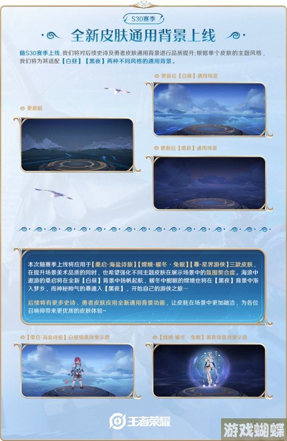 随S30赛季上线,我们将对后续史诗及勇者皮肤通用背景进行品质提升:根据单个皮肤的主题风格,我们将为其适配【白昼】【黑夜】两种不同风格的通用背景