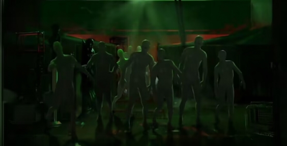 商场里的塑料模特此时活了过来,像一群丧尸一样朝着主角逼近,主角关上商场的栅栏门,但显然组织不了这些怪物太久。