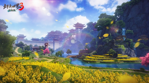 这次更新对于风景党来说也算一个不小的惊喜。首先我们非常熟悉的龙泉村和虎丘剑池,在此次焕新版中获得了全面高清重置。比如新手村——龙泉村,原来是山石环绕,地形逼仄狭窄。这次焕新后,灿烂阳光下,一片花海铺就成侠之路,宛如拨云见日,视野更加开阔。